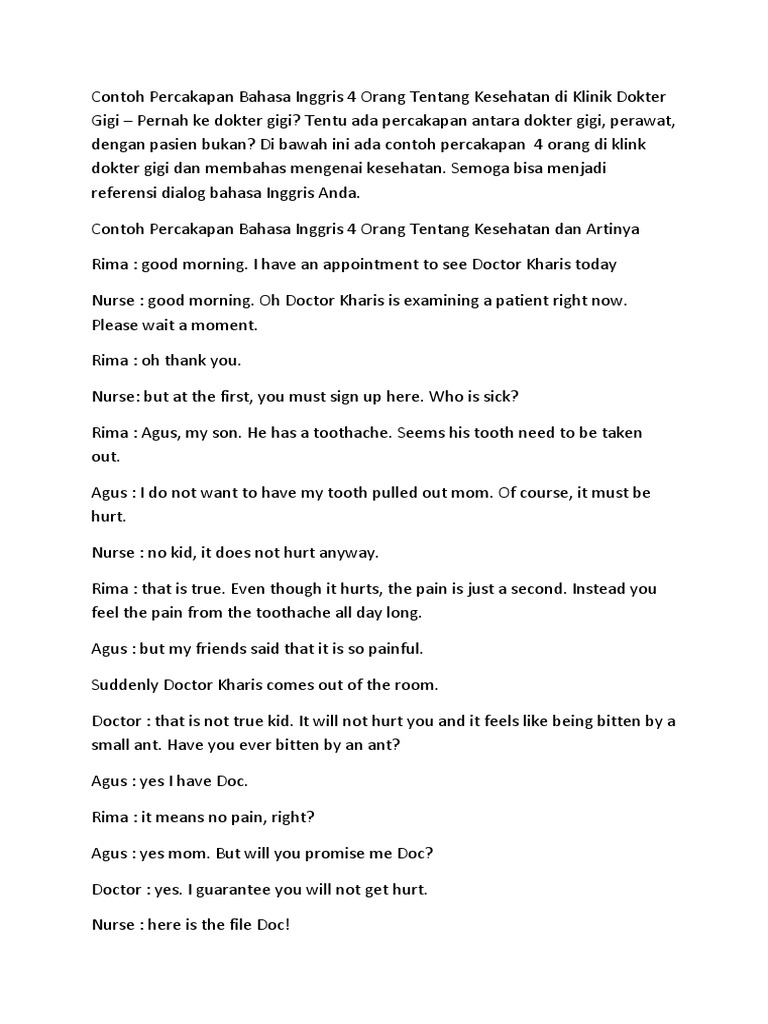Contoh dialog bahasa inggris 4 orang di restoran berikut ini berisi sejumlah frasa dan kosa kata dalam bahasa inggris yang berhubungan dengan restoran di mulai dari cara memesan makanan sampai mengomentari rasa makanannya. You look hard to do it alone ben. Kali ini kita akan melihat contoh dialog bahasa inggris 4 orang tentang liburan. Contoh naskah drama untuk 4 orang by posted on jika teks dialog dramanya ditulis dengan baik nan lengkap maka ia akan memudahkan para pemeran drama tersebutnaskah drama yang akan saya share berikut ini merupakan contoh naskah drama pendek untuk dimainkan oleh 4 orang pemeran. Thanks andy youre so kind but i think i can manage by myself. No its a pair taski should do it with my seatmate.