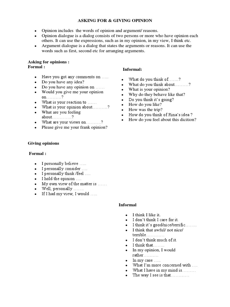 Contoh dialog asking and giving opinion. Discussing a bands new music album. Contoh dialog percakapan dan kalimat giving suggestion atau memberi saran dalam bahasa inggris. Contoh lengkap dialog bahasa inggris sehari hari. The sample dialogue contoh dialog asking and giving opinion. Contoh dialog asking and giving opinion 5 situation. Kumpulan kata asking and giving opinion meminta dan memberi pendapat dalam bahasa inggris beserta contoh dialog setelah membahas mengenai opini dan fakta pada materi sebelumnya kali ini kita akan.