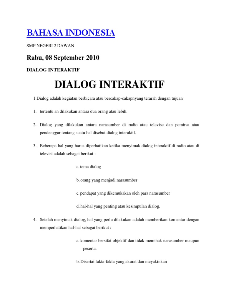 Dialog interaktif adalah materi smp kelas 9 yang akan kita pelajari kali inidialog interaktif ini sangat sering kita jumpai di berbagai media massa terutama tv. Walaupun biasanya kesimpulan tersebut dibacakan oleh moderator namun kita juga harus menyimpulkan nya sendiri sebab bisa jadi apa yang kita dapat berbeda dengan yang orang lain dapatkan. Sekarang saya mau berbagi beberapa contoh dialog interaktif beserta kesimpulannya karena sebelumnya saya sudah pernah membuat contohnya saya akan membahas yang itu saja yaitu tentang vaksin palsuberikut ulasannya. Dialog interaktif pengertian contoh keseahtan kesimpulan dosenpendidikancom dialog interaktif terdiri dari dua kata yaitu dialog dan interaktif dimana kata dialog berarti karya tulis yang disajikan dalam bentuk percakapan antara dua tokoh atau lebih sementara pengertian interaktif adalah bersifat saling aksi. Contoh dialog interaktif beserta kesimpulannya. Contoh soal dialog interaktif singkat dan panjang lengkap by mughnifar ilham posted on march 17 2020 contoh soal dialog interaktif dialog interaktif adalah sebuah dialog atau perbincangan atau percakapan yang dilakukan pada sebuah acara di televisi atau radio antara pembawa acara dengan pendengar melalui sambungan telepon.