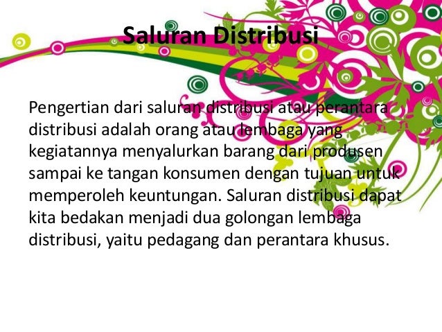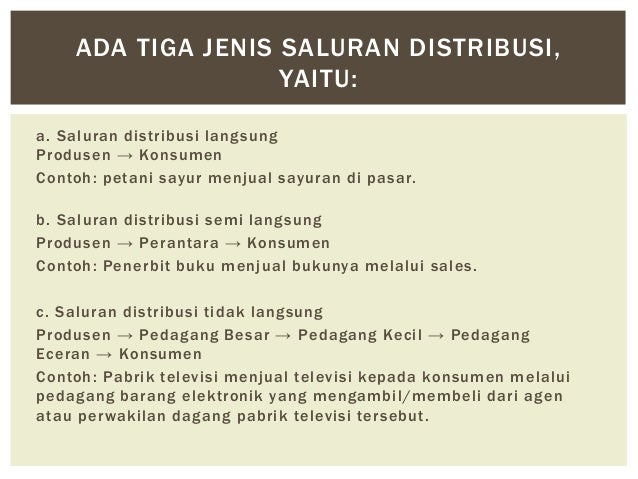 Besarnya jumlah produksi dan modal yang cukup juga menjadi faktor penentu. Ada beberapa hal yang menjadi alasan dilakukannya distribusi ini seperti. Pihak lembaga pemasaran miliki produsenperusahaan mengantar produk kepada konsumen. Contoh distribusi tidak langsung. Distribusi semi langsung biasanya dilakukan oleh produsen barangbarang berkualitas baik dan mahal karena barang barang tersebut memerlukan penanganan yang khusus oleh ahlinya sehingga dengan adanya agen yang memerlukan wakil perusahaan maka kualitas barang dapat dijaga. Distribusi barang dari produsen sampai ke tangan konsumen dilakukan dengan dua cara yaitu sebagai berikut.
