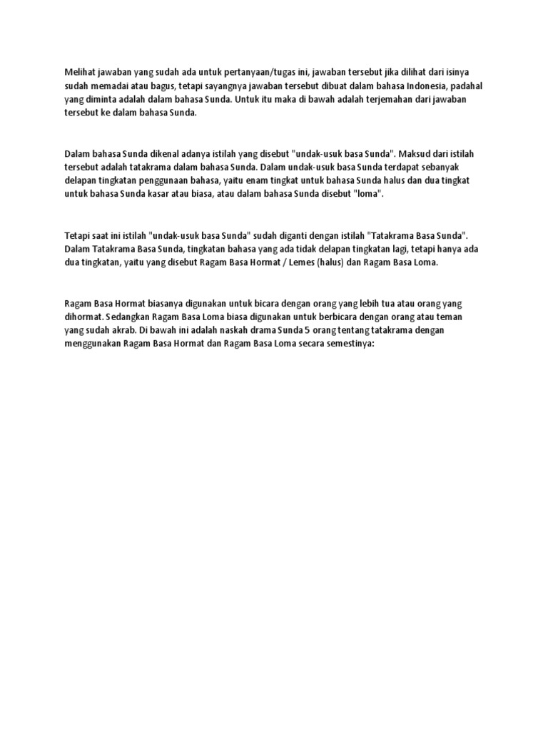 Sebelum membuat sebuah naskah drama setidaknya kita memerlukan waktu yang tidak sebentar untuk penulisan teks serta menyusun alur ceritanya agar menghasilkan drama yang bagustentu ini bukanlah hal yang sangat mudah apalagi untuk 8 orang dan harus dituliskan kedalam bentuk bahasa sunda. Caranya adalah dengan mengambil naskah drama dalam bahasa indonesia lalu kemudian kita terjemahkan ke dalam bahasa sunda dengan menggunakan website kamus pernerjemah bahasa indonesia ke bahasa sunda. Naskah drama basa sunda. Naskah drama pendek untuk dua orang pemain. Contoh drama bahasa sunda si kabayan jadi boyband 2200 bahasa sunda naskah drama 0 comments lima taun baheula kabayan jeung iteung meunang pagawean anu resikona kedah misahkeun manehna duaansateuacan etamanehna duaan ngikrarkeun janji satia. Contoh makalah bahasa sunda.