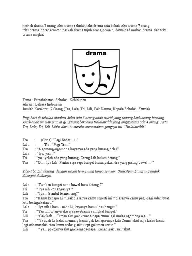 Contoh drama singkat 4 orang. Tomy sedang ngobrol dengan lisa disebuah taman yang tidak jauh dari rumah mereka. Ari sudah memasuki kelas 3 sma dan sebentar lagi akan melanjutkan kuliah. Contoh teks drama singkat 4 orang. Posting pada uncategorized ditag contoh drama tentang ekonomi contoh naskah 3 paragraf contoh naskah drama 2 orang contoh naskah drama 5 orang tentang pendidikan singkat contoh naskah drama bahasa jawa 8 orang contoh naskah drama panjang 6 orang contoh naskah drama panjang untuk 10 orang contoh naskah drama satu babak pendek contoh. Drama yang diatur sedemikian rapinya oleh yang maha pencipta. Teater persahabatan lucu komedi 3 5 6 7 8 9 orang untuk pembahasan kali ini kami akan mengulas mengenai naskah drama yang dimana.