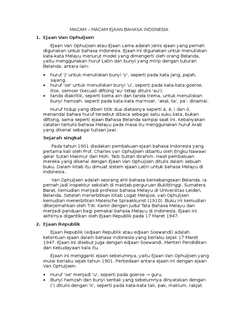 Ejaan van ophuijsen ini telah dipakai selama 46 tahun lebih lama dari ejaan republic dan baru diganti setalah dua tahun indonesia merdeka. 1 masih menggunakan huruf j untuk bunyi huruf y seperti contoh yang atau sayang ditulis dengan jang sajang. Aturan dan contoh mengenai ejaan ini dijelaskan lebih rinci pada sub bab contoh. Ejaan yang disempurnakan eyd eyd diresmikan pada saat pidato kenegaraan memperingati hut kemerdekaan ri xxvii 17 agustus 1972. Ejaan ini ditetapkan pada tahun 1901 yaitu ejaan bahasa melayu dengan huruf latin. Ejaan tersebut dirancang oleh van ophuijsen dibantu oleh engku nawawi gelar soetan mamoer dan moehammad taib soetan ibrahim.