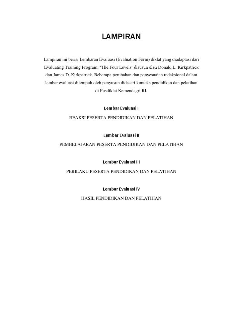 Nah untuk membantu anda dalam menyusun program evaluasi pelatihan karyawan anda bisa menggunakan model evaluasi kirkpatrick yang sudah sangat populer dan banyak digunakan. Laporan evaluasi program bppp ambon tahun 2018 1. Latar belakang guru adalah faktor utama yang menentukan berhasil atau tidaknya suatu pembelajaran di setiap jenjang sekolahpembelajaran merupakan kegiatan yang menumbuhkan pemahamankreativitas daya pikir potensi dan minat siswa. Program pelatihan penyusunan dan pendampingan penelitian tindakan kelas bagi guru sma se kota padang di lpmp unp padang a. Proses evaluasi pada tahap awal yaitu sebelum pelatihan dinamakan dengan need assessment atau mencari tahu keterampilan dan kebutuhan dari para peserta pendidikan dan latihan serta pengembangan sumber. Untuk pegawai peserta pelatihan.