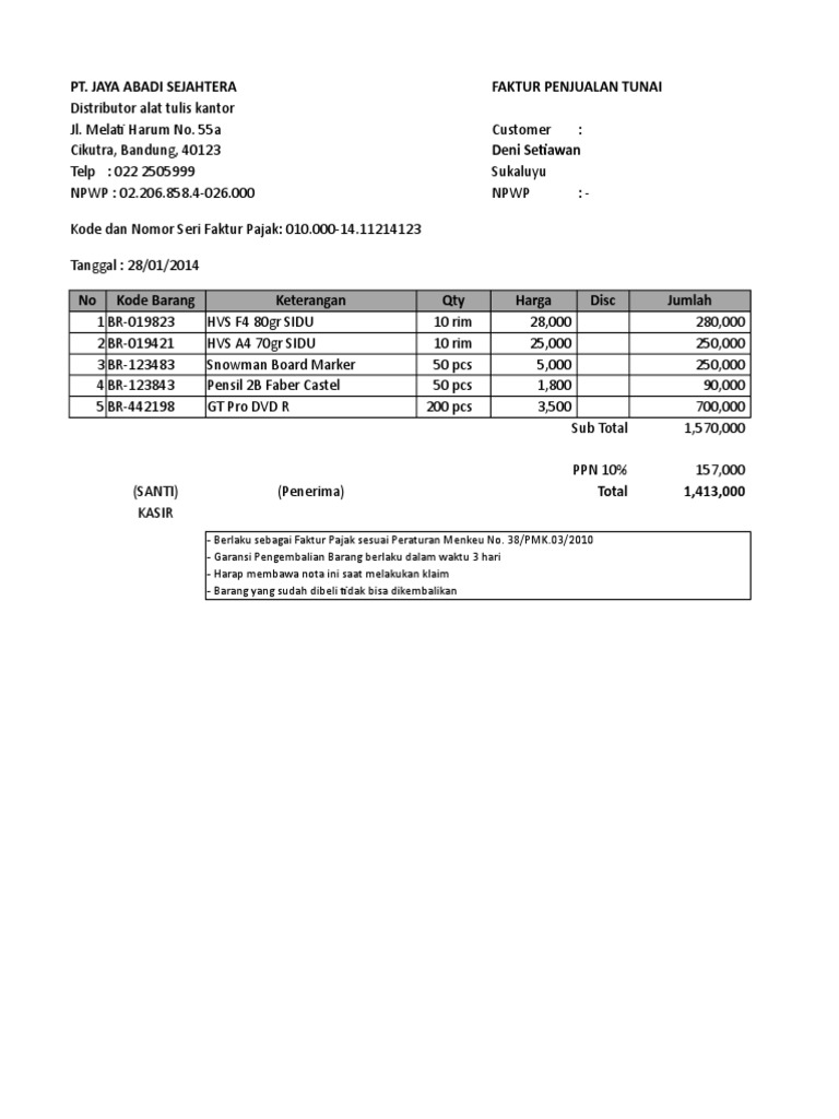 Contoh faktur pembelian dan penjualan. Saat terjadi penambahan piutang dagang maka dicatat pada posisi debit karena piutang adalah salah satu jenis harta dan sebaiknya ketika terjadi penambahan pendapatan dari hasil penjualan maka dicatat pada posisi kredit. Agar lebih jelas lagi berikut ini contoh faktur penjualan dalam bentuk gambar. Contoh di atas bisa anda lihat dan dapatkan dalam format spreadsheet. Berikut ini adalah preview nya yang lebih rapih yhaa. Hal ini pada umumnya diperoleh dan diberikan setelah serah terima barang kena pajak atau setelah konsumen menerima jasa kena pajak. Faktur penjualan biasanya diberikan oleh penjual bersama dengan penyerahanpengiriman barang atau jasa.