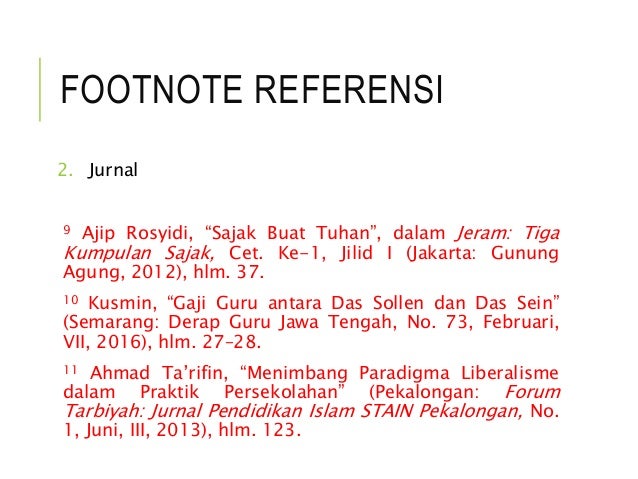 Contoh jurnal salah satu tugas dari seorang mahasiswa dan dosen adalah menulis karya ilmiah salah satunya adalah jurnal. Footnote dari jurnal atau majalah ilmiah jurnal atau majalah ilmiah ditulis dengan urutan. Identitas jurnal volume nomor dan sebagainya tahun publikasi. Dalam membuat footnote pada kutipan dari jurnal maupun majalan mengikuti format penulisan sebagai berikut. Cara menulis footnote dari berbagai sumber. Nama penulis tahun penerbitan jurnal judul artikel diketik diantara tanda petik nama jurnalmajalah ilmiah diketik miring lengkap dengan nomor volume dan bulan tahun penerbitan dan nomor halaman artikel itu dimuat.