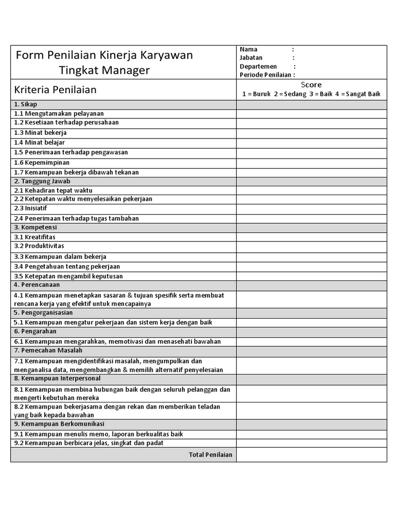 Sebenarnya form ini hanya sebagai contoh saja yang saya cari di google dan menurut saya ini bisa menjadi acuan contoh form penilaian kinerja. Manfaat penilaian kinerja karyawan. Syarat penilaian kinerja suatu sistem penilaian kinerja harus mampu menggambarkan secara akurat kinerja yang tipikal dari seorang karyawan. Contoh form standar penilaian kinerja karyawan. Skala ditetapkan dari yang terendah hingga yang tertinggi. Dapat dipahami dengan mudah oleh para evaluator dan karyawan.