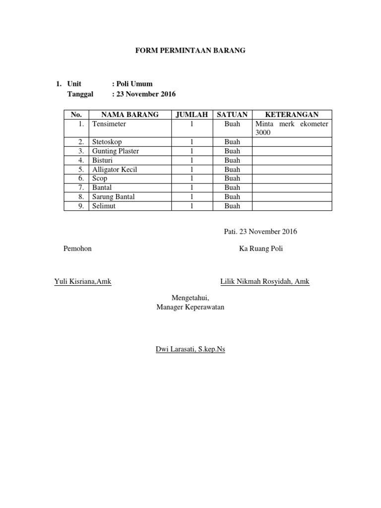 Contoh form permintaan barang. Contoh form peminjaman barang inventaris kantor resmi barang inventaris kantor merupakan salah satu barang yang harus di jaga karena merupakan aset dari perusahaan. Contoh permintaan alat kesehatan di puskesmas bati bati tahun 2016. Surat permintaan barang adalah surat yang dibuat oleh calon pembeli buyer kepada penjualprodusen seller barang untuk mengirimkan barangjasaproduk yang dibutuhkan oleh calon pembeli tersebut. Dengan sharing ini semoga bisa membantu teman teman semuanya d kritik dan saran sangat diperlukan. Nah pada kesempatan ini admin akan mencoba share. Download contoh surat pengajuan barang doc.