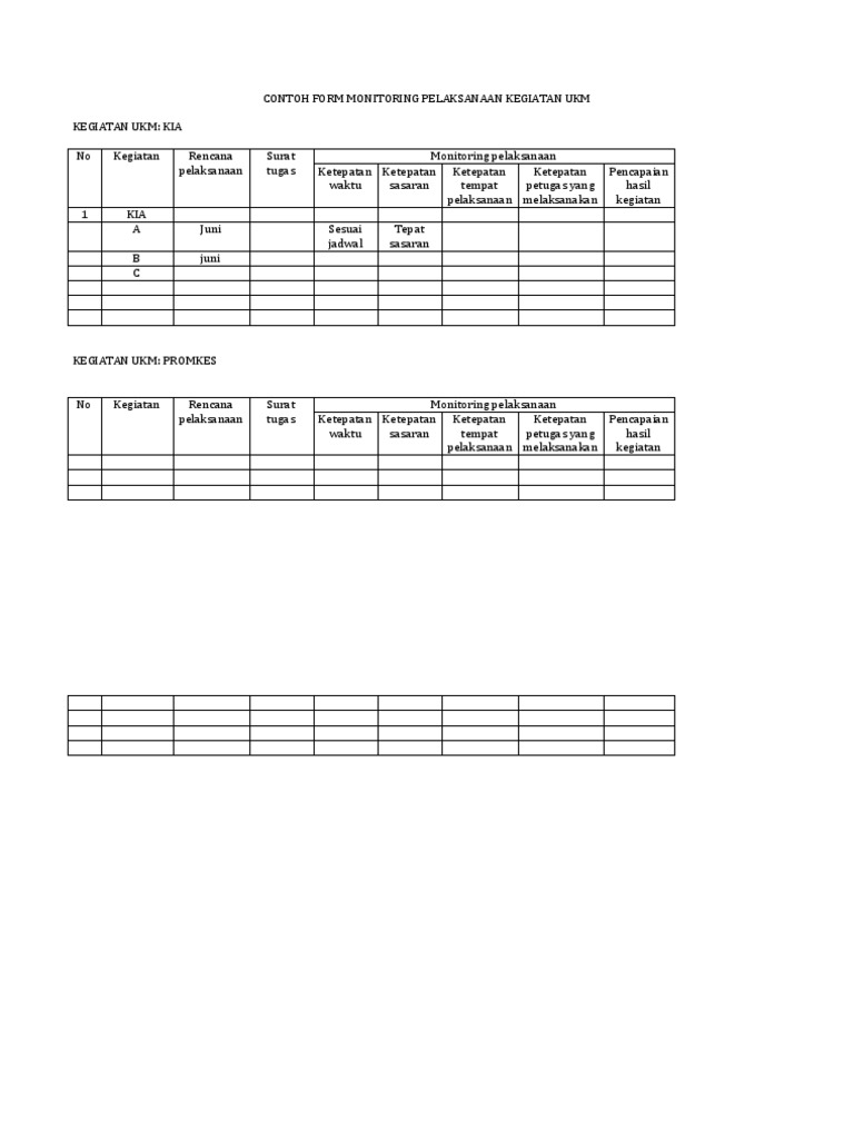 Contoh format monitoring kegiatan. Hasil evaluasi dituangkan dalam format berita acara hasil evaluasi rut contoh terlampir22 panduan monitoring dan evaluasi rut 24. Pelaksanaan kegiatan ukm puskesmas dilakukan dengan cara mengunjungi tempat pelaksaan kegiatan dengan membawa format monitoring kemudian pelaksanaan kegiatan dipantau apakah sesuai dengan sasaran tempat dan waktu pelaksanaan kegiatan dengan cara mencontreng pada kolom s jika sesuai dan mencontreng ts jika tidak sesuai. Format monitoring kegiatan ekstrakurikuler. Menurut peraturan pemerintah nomor 39 tahun 2006 disebutkan bahwa monitoring merupakan suatu kegiatan mengamati secara seksama suatu keadaan atau kondisi termasuk juga perilaku atau kegiatan tertentu dengan tujuan agar semua data masukan atau informasi yang diperoleh dari hasil pengamatan tersebut dapat menjadi landasan dalam mengambil keputusan tindakan selanjutnya yang diperlukan. Perlu peningkatan dalam memberikan contoh contoh kegiatan kepramukaan dalam kehidupan sehari hari peserta didik sehingga dapat dipahami manfaat dari keterampilan yang dipelajari. Monitoring dan evaluasi kegiatan tim monev rut yang berintikan tim panel sekretariat rut sebagai pendamping dan kmnrt akan melakukan kunjungan lapangan untuk memantau secara langsung kegiatan rut di laboratorium tempat rut dilaksanakan.