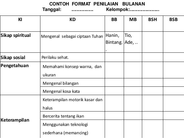 Contoh format penilaian harian mingguan bulanan ra kurikulum 2013 dalam setiap lembaga pendidikan tak lepas dari yang namanya penilaian baik penilaian harian mingguan bulanan. Contoh format instrumen penilaian harian tkpaud kurikulum 2013 informasi guru berikut ini adalah contoh format instrumen penilaian harian tkpaud kurikulum 2013 yang bisa anda download secara gratis di website kami. Jadi untuk ayah bunda yang membutuhkan bisa download disini. Berikut contoh format penilaian bulanan paudtk kurikulum 2013 yang biasa dialakukan dalam per satu bulan sekali setelah sebelumnya dilakukan penilaian harian tk kurikulum 2013. Contoh penilaian harian paud. Untuk lebih jelasnya lihat contoh format check list perkembangan indikator paud klik disini.