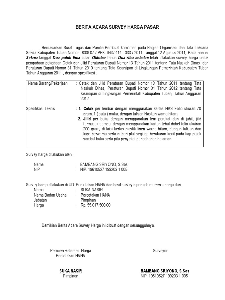 Contoh laporan survai pasar. Umumnya surat penawaran digunakan oleh perusahaan perusahaan penyaluran dalam hal ini distributor. Surat penawaran seringkali berbentuk formal dan dengan jelas juga mencantumkan rincian harga juga barang yang ditawarkan akan dijual. Contoh berita acara survey harga pasar. Ppk membuat spesifikasi teknis dan harga perkiraan sendiri dengan cara melakukan survey harga pasar yang membandingkan harga dari dua sumber berbeda sehingga ditemukan harga yang wajar. 1913 makalah no.