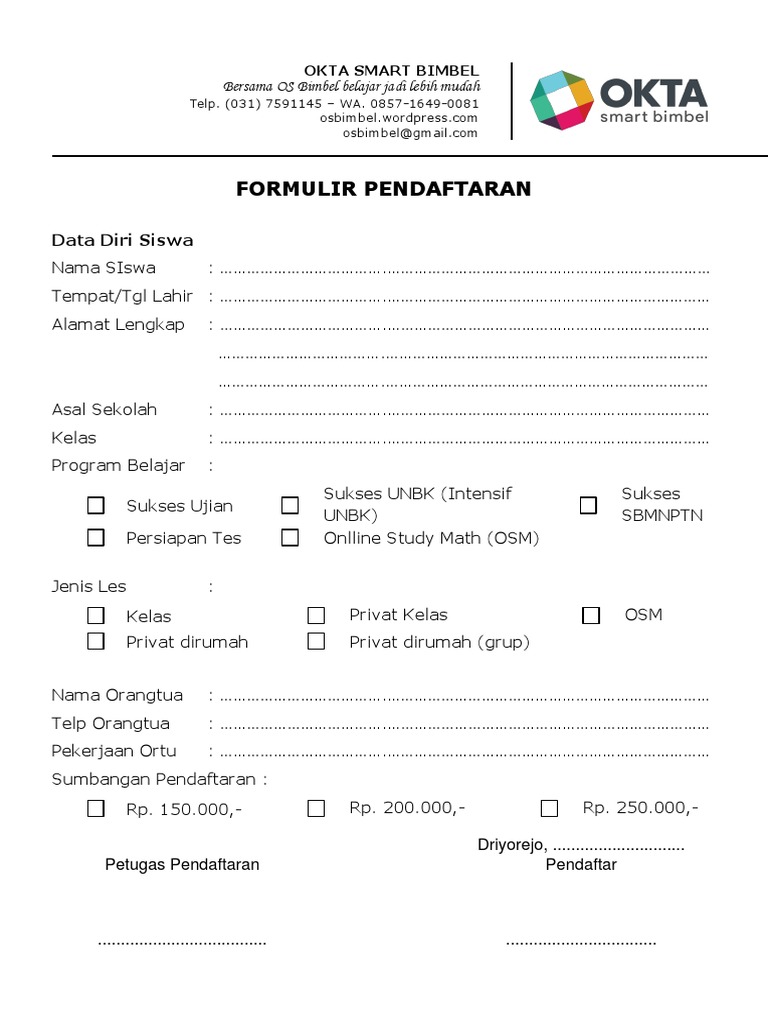 Contoh formulir pendaftaran sekolah dalam rangka menyambut datangnya tahun pelajaran baru 20182019 kali ini kami akan membagikan salah satu berkas yang berkaitan dengan kegiatan penerimaan siswa baru atau yang saat ini dikenal juga dengan penerimaan peserta didik baru. Semoga sehat selalu ya. Ini dia update 2018 dari contoh formulir pendaftaran siswa baru untuk ppdb 2017 2018 materi terkait akan dibagikan lewat postingan hari ini dibagikan dalam format file file yang diambil dari sumber terpercaya dan file tersebut bisa dimanfaatkan oleh guru dalam menampung calon siswai baru yang akan daftar di masing masing sekolah. Contoh formulir contoh format cv contoh format sop contoh format proposal contoh formal invitation contoh format undangan contoh form data karyawan contoh form kwitansi excel contoh form tanda terima contoh formulir bahasa inggris contoh formulir pendaftaran lomba siswa baru source. Contoh formulir pendaftaran anggota baru organisasi source. Contoh formulir dalam bahasa inggris beserta artinya kuvelu tetseo 40 contoh soal grammar dan kunci jawaban pembahasan muttaqin id contoh po purchase order dan cara membuatnya kumpulan.