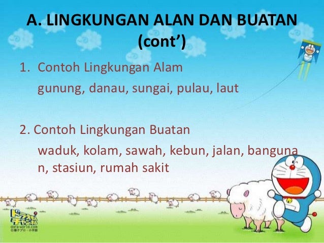 Sekarang ini pun kamu tinggal di lingkungan buatan. Dari halaman belakang sekolah terlihat bentuk muka bumi yang menonjol tinggi dan besar di kejauhan. Sebuah khayalan tentang betapa indahnya kondisi alam yang terjaga dan jauh dari segala polusi. Pegunungan sungai danau pantai dan laut dll. Poster bertema lingkungan jika berbicara tentang lingkungan semua pasti membayangkan sebuah lingkungan hijau nan sejuk yang ditumbuhi oleh berbagai jenis tanaman hijau tempat tinggal berbagai jenis satwa. Lingkungan alam adalah segala sesuatu yang ada di alam dan diciptakan oleh tuhan.