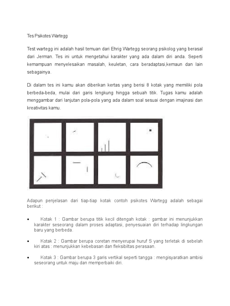 Hasil gambar tes wartegg 1 hasil gambar tes wartegg 2 hasil gambar tes wartegg 3 hasil gambar tes wartegg 4 demikian penjelasan materi tentang tes wartegg. Dalam tes wartegg terdapat 8 delapan kotak yang masing masing kotak yang berisi suatu gambar yang berbeda beda mulai dari titik garis kurva tiga garis sejajar kotak kecil yang diberi warna hitam dua garis yang saling memotong dan titik yang tersusun melengkung serta terakhir garis lengkung cukup besar. Tes wartegg makalah materi definisi pengertian keterangan gambar tips cara mengerjakannya cara membaca dan contoh soal tes wartegg. Contoh gambar tes wartegg yang sudah dikerjakan. Tes ini dibuat untuk mengetahui karakter seseorang dari segi imajinasi emosi dinamisme reality function dan kemampuannya dalam mengontrol sesuatu. Pengertian sejarah tips spesifikasi tahapan rasionalisasi petunjuk skema dan contoh semoga materinya bermanfaat bagi siswa siswi.