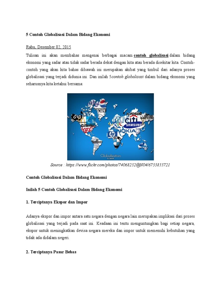 Contoh contoh yang akan kita bahas dibawah ini merupakan akibat yang timbul dari adanya proses globalisasi yang terjadi didunia ini. Adapun beberapa hubungan ekonomi antar negara yaitu sebagai berikut. Bidang ekonomi adalah bidang yang sangat erat dengan hubungan antar negara banyak sekali kerja sama atau interaksi yang dilakukan untuk kepentingan bersama. Pengertian dampak positif negatif adalah suatu proses kegiatan ekonomi dan perdagangan dimana negara negara di seluruh dunia menjadi satu kekuatan pasar yang semakin terintegrasi dengan tanpa rintangan batas teritorial negara. Terima kasih sudah berkunjung kemari dan semoga tulisannya mengenai contoh globalisasi dalam.