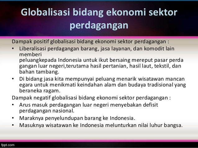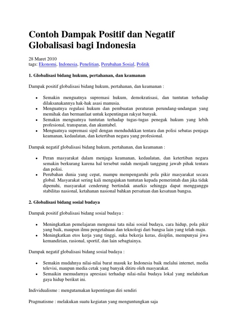 Dampak globalisasi di indonesia bidang teknologi dan komunikasi pengaruh globalisasi di indonesia tidak dapat hanya dilihat dari satu sudut pandang saja karena selain dampak positif yang muncul dari globalisasi juga ada dampak negatif di samping keuntungan keuntungan yang kita dapat dari globalisasi. Globalisasi di bidang politik pengertian dampak pengaruh dan contohnya dosenpendidikancom pengertian globalisasi yang diambil dari kata global yang memiliki arti atau makna adalah universal.