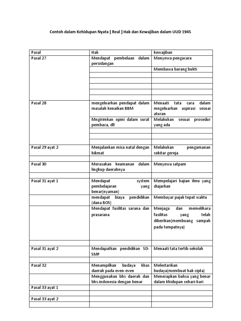 Hak adalah sesuatu yang sudah semestinya kita terima yang. Setiap warga negara berhak mempertahankan wilayah negara kesatuan republik indonesia. Setiap warga masyarakat harus ikut bertanggung jawab terhadap pembangunan nasional. Semua organisasi tetap harus dengan berdasarkan dasar pancasila sebagai azasnya landasan dasar semua media pers dalam mengeluarkan pikiran landasan dasar pembuatannya. Hak berserikat dan berkumpul. Berikut hak dan kewajiban setiap warga negara terhadap sumber energi dan pemanfaatanya.