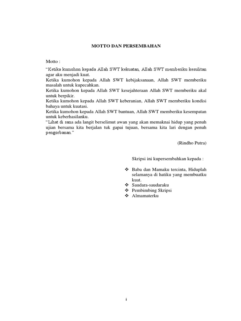Contoh halaman persembahan dan motto. Dan yang terpenting pastikan halaman persembahan ditujukan kepada pihak yang benar benar berkontribusi 5. Halaman persembahan juga kadang berisi moto dan motivasi. Halaman motto dan persembahan contoh persembahan skripsi contoh soal dan materi pelajaran 10 analisis kemampuan berpikir kreatif siswa dalam halaman persembahan dan motto 10 halaman persembahan skripsi yang unik anti mainstream halaman karya ilmiah 1dee doc. Bacaterus telah mengumpulkan 10 halaman persembahan skripsi yang unik mulai dari yang lucu sedih hingga puitis. O setiap pekerjaan dapat diselesaikan dengan mudah bila dikerjakan tanpa keengganan. Motto memang sangat penting walaupun beberapa menganggap remeh kalimat motto tersebut.