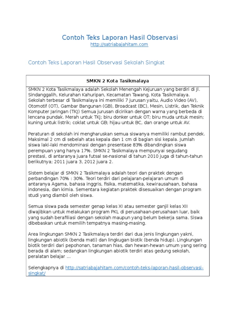 Materibelajarcoid materi belajar gratis. Contoh teks laporan hasil observasi tahukah kalian observasi merupakan sebuah penelitian yang salah satu teknik dalam pengumpulan datanya digunakan dalam suatu penelitian tertentu. Sedangkan untuk teks hasil observasinya mempunyai pengertian isi teks yang menjelaskan tentang suatu informasi baik itu hewan tanaman fenomena alam hasil karya manusia serta fenomena sosial yang sesuai. Contoh teks laporan hasil observasi hewan artikel ini secara khusus hanya akan membahas contoh contoh mengenai teks hasil observasi dimana sebelumnya juga pernah kita bahas mengenai pengertian struktur teks laporan hasil observasi tujuan fungsi ciri ciri dan lainnya. Ciri ciri laporan hasil observasi adalah sebagai berikut. Contoh laporan hasil wawancara laporan hasil wawancara adalah sebuah teks tertulis yang melaporkan suatu wawancara yang telah dilakukan baik itu wawancara dengan pedagang pengusaha guru ketua rt.