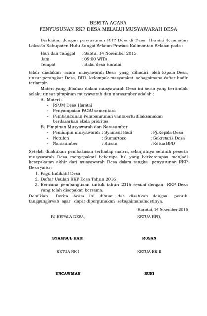 Contoh berita acara musyawarah desa berkaitan dengan pelaksanaan program pembangunan infrastruktur perdesaa n tahun 2013 di desa klampisan kecamatan kandangan kabupaten kediri provinsi jawa timur maka pada hari ini. 1 penerbitan sk kades untuk tim delegasi desa. Musrenbang harus dipandang sebagai saluran resmi yang dipersiapkan untuk mengkanalisasi aspirasi masyarakat dalam rangka memperoleh akses yang memadai dalam kebijakan penganggaran pembangunan. Untuk itu maka mutu proses dan mutu hasil musrenbang akan sangat menentukan efektifitas penyaluran aspirasi dan kebutuhan masyarakat. Di desa dan kecamatan dikenal dengan sebutan musrenbang desa dan musrenbang kecamatan. Bagi aparatur pemerintah dari level desa sampai pemerintah pusat awal tahun berarti siap melaksanakan perencanaan yang dibuat pada tahun sebelumnya dan harus memulai membuat perencanaan tahun mendatang.