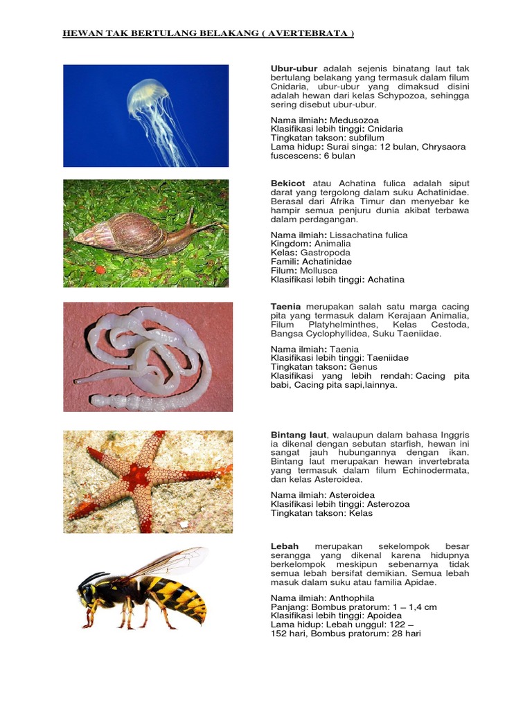 Contoh hewan tidak bertulang belakang. Hewan tidak bertulang belakang avertebrata dikelompokkan menjadi delapan kelompok yaitu hewan berpori porifera hewan berongga coelenterata cacing pipih platyheminthes cacing gilig nemathelminthes cacing berbuku buku annelida hewan lunak mollusca hewan berkulit duri. Dunia hewan berdasar pada ada tidaknya tulang belakang digolongkan jadi hewan bertulang belakang vertebrata serta hewan tidak bertulang belakang avertebrata. Hingga tahun 1999 pertanyaan apakah vertebrata hewan bertulang belakang ada di zaman kambrium terbatas pada debat tentang pikaia. Grup hewan avertebrata memiliki tanda tanda tak bertulang belakang susunan syaraf terdapat dibagian ventral perut dibawah saluran pencernaan biasanya mempunyai rangka luar eksoskeleton serta otak tak dilindungi oleh tengkorak. Contoh hewan avertebrata dan vertebrata yaitu hewan tidak bertulang belakang dan bertulang belakang diantaranya cumi cumi gurita burung dan lain lain. Ciri dan kelompok hewan bertulang belakang dan tidak bertulang belakang sahabat pendidikan sekalian berhubungan dengan artikel sebelumnya yang membahas mengenai tumbuh tumbuhan perlu kita ketahui pula bahwa hewan didunia ini juga sangat beragam mulai dari yang besar hingga yang paling kecil dan juga memiliki bentuk atau wujud fisik mereka yang berbeda beda.