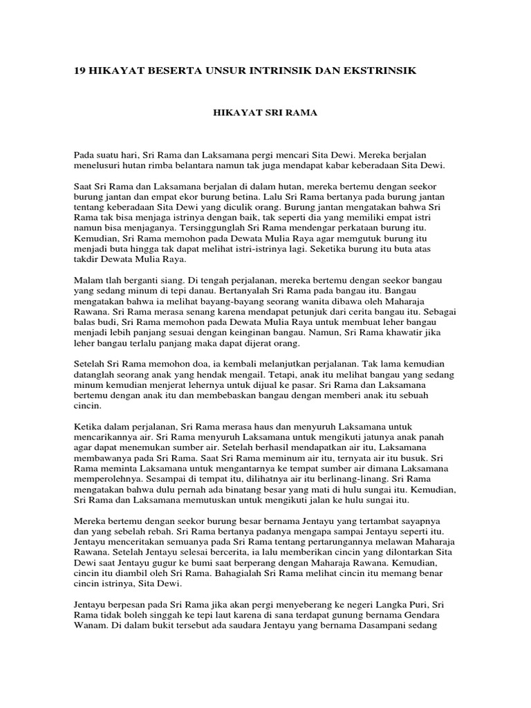 Contoh hikayat pendek beserta unsur intrinsik dan ekstrinsik. Jika diibaratkan pada sebuah bangunan unsur unsur tersebut merupakan material pokok pondasinya seperti pasir batu dan semen. Cerpen yang biasa juga dinamakan dengan prosa atau karangan fiksi memiliki isi pengisahan yang hanya berfokus pada sebatas satu permasalahan atau konflik. Hatta malim deman pun menjadi seorang raja yang sangat bijaksana lagi gagah berani. Kedua unsur tersebut sangat diperlukan guna membangun sebuah karya menjadi lebih hidup. Unsur intrinsik cerpen cerpen cerita pendek merupakan diantara jenis karya sastra yang menggambarkan cerita atau kisah alur hidup manusia dalam bentuk tulisan yang ringkas dan jelas. Dan baginda katiga laki istri juga sangat sayang kepada puteranya.