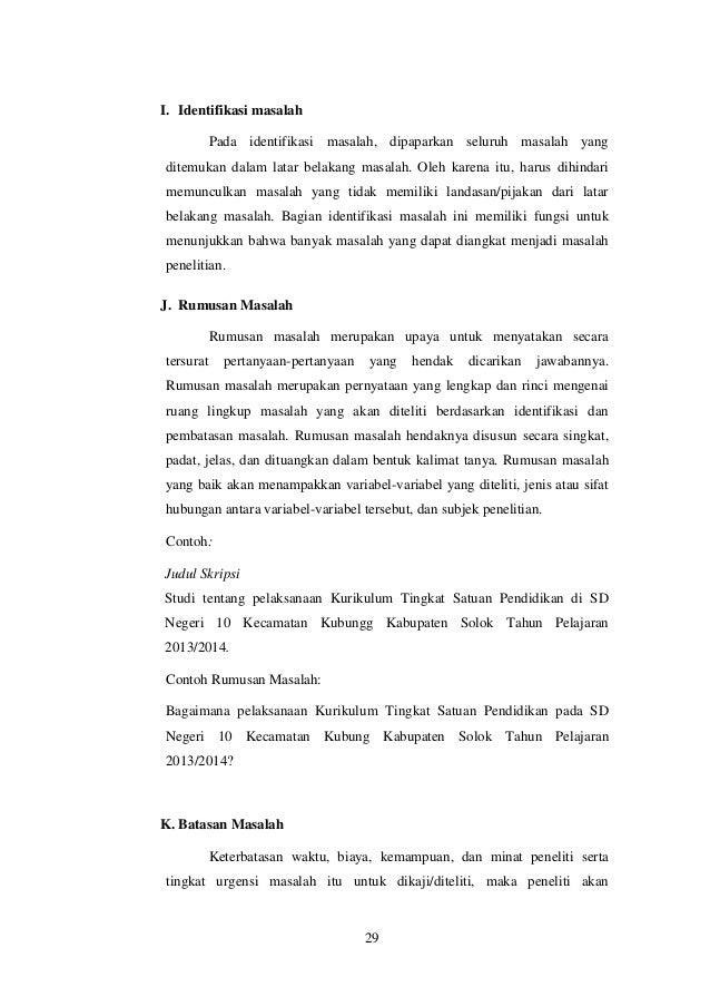 Metode penelitian kualitatif saat anda mengijak perguruan tinggi dan menginjak semester akhir biasanya akan di beri tugas untuk membuat karya penelitian nah salah satunya adalah penelitian kualitatif ini untuk mempermudah anda dalam mencari referensi berikut adalah pembahasa lengkap mengenai metode penelitian kualitatif serta contoh dan pembahasannya. Jadi untuk lebih jelasnya mari kita simak bersama. Dalam penelitian sosial proses identifikasi masalah dapat dilakukan dengan mendeteksi permasalahan sosial yang diamati. Untuk memilih dan menentukan masalah yang layak untuk diteliti perlu mempertimbangkan kriteria problematika yang tertata baik. 6 responses to contoh skripsi identifikasi masalah batasan dan rumusan masalah tujuan dan manfaat penelitian seocontoh september 8 2017 at 717 pm terima kasih sangat membantu. Bagian ini juga menampilkan faktor faktor apa saja yang memiliki kaitan dengan masalah tersebut.