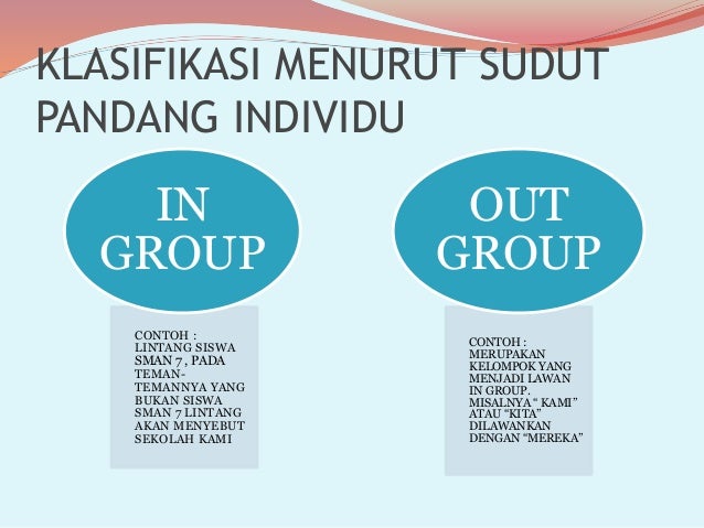 Pengertian in group dan out group adalah topik yang kami ulas. Pengklasifikasian ini dikenal dengan he basis of identification yang artinya berdasarkan bagaimana dan dengan siapa individu mengidentifikasi dirinya menjadi anggota daripada kelompok tertentu. Untuk membedakan antara in group dan out group kita membuat batas boundaries yang menentukan siapa masuk ke dalam dan siapa orang luar. In group out group pembahasan. Klasifikasi in group dan out group. In group out group contoh on.