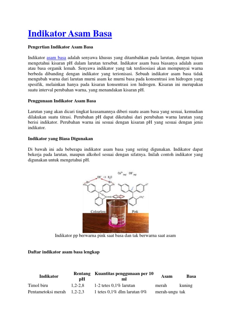 Indikator asam basa adalah senyawa khusus yang ditambahkan pada larutan dengan tujuan mengetahui kisaran ph dalam larutan tersebut. Pengertian larutan asam basa contoh serta indikator asam basa by muhammad mahfuzh huda posted on november 2 2014 january 8 2018. Makalah teori indikator asam basa. Asam adalah senyawa kimia yang bila dilarutkan dalam air akan menghasilkan larutan dengan ph lebih kecil dari 7basa adalah senyawa kimia yang menyerap ion hidronium ketika dilarutkan dalam air. Fenolftalein metil jingga kertas lakmus lakmus merah dan kertas lakmus biru dan indikator universal. Senyawa indikator yang tak terdisosiasi akan mempunyai warna berbeda dibanding dengan indikator yang terionisasi.