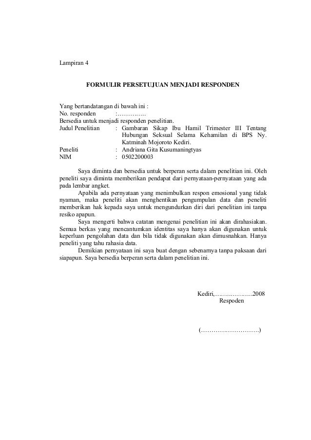 Penelitian dan bersedia melakukan pemeriksaan sesuai dengan data yang diperlukan. Academiaedu is a platform for academics to share research papers. Demikian pernyataan ini dibuat dengan penuh kesadaran tanpa ada paksaan dari pihak manapun. Formulir persetujuan penelitian informed consent saya yang bernama nurrahmaton 105102017 adalah mahasiswi diploma d iv bidan pendidik fakultas keperawatan universitas sumatera utara. Materi diskusi dalam perkuliahan hukum kesehatan. Contoh informed consent eksperimen psikologi.