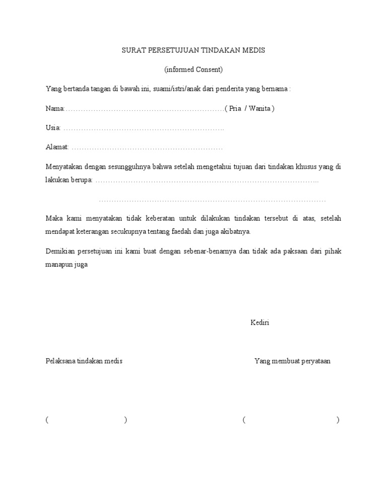 Contoh informed consent tindakan medis. Macam macam bentuk panggul pada wanita. Dohoagung rt 02rw 01 balongpanggang gresik. Ada 2 bentuk persetujuan tindakan medis yaitu 16 1. Implied consent dianggap diberikan umumnya implied consent diberikan dalam keadaan normal artinya dokter dapat menangkap persetujuan tindakan medis tersebut dari isyarat yang diberikandilakukan pasien. Diharapkan setelah keterampilan ini mahasiswa dapat melakukan teknik konseling dan edukasi kesehatan dengan baik dan melakukan informed consent pada pasien. Demikian pula pada kasus.