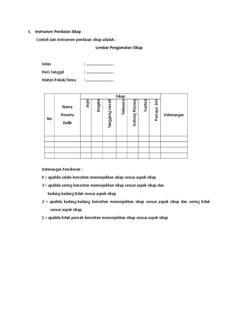 Contoh instrumen penilaian sikap. Persyaratan substansi merepresen tasikan kompetensi yang dinilai persyaratan konstruksi memenuhi persyaratan teknis sesuai dengan bentuk instrumen yang digunakan dan persyaratan bahasa adalah penggunaan bahasa yang baik dan benar serta komunikatif sesuai dengan tingkat perkembangan peserta didik. Penentuan teknik penilaian sikap harus diikuti dengan penentuan instrumen penilaian. Demikianlah ulasan indikator penilaian sikap spiritual dan sikap sosial dalam kurikulum 2013 yang admin sarikan dari modul implementasi kurikulum 2013. Instrumen yang digunakan untuk observasi penilaian diri dan penilaian antarpeserta didik adalah daftar cek atau skala penilaian rating scale yang disertai rubrik. Contoh instrumen penilaian sikap kurikulum 2013 penilaian sikap dalam kurikulum 2013 dilakukan dengan menggunakan teknik observasipengamatan penilaian diri penilaian antar teman dan jurnal catatan guru. Data penilaian sikap bersumber dari hasil penilaian melalui teknik observasi penilaian diri penilaian antarpeserta didik dan jurnal.