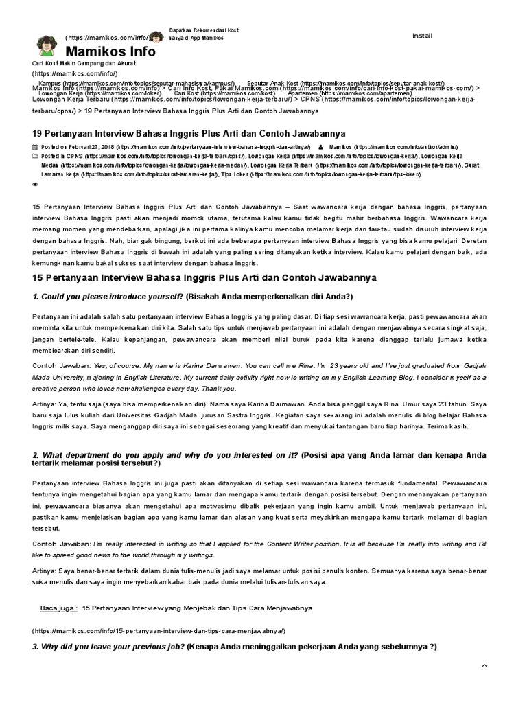 Itulah sekian banyak contoh pertanyaan interview bahasa inggris dan artinya yang bisa anda pelajari. Artikel ini dibuat untuk membantu anda dalam menghadapi interview kerja dalam bahasa inggris. Nah salah satunya dengan mempelajari percakapan dibawah ini. Melamar kerja adalah suatu hal yang cukup membuat banyak orang ketakutan terutama ketika sudah lolos ke bagian wawancara. Beberapa orang dapat sedikit mengurangi ketegangan dengan melakukan persiapan yang baik. Contoh teks perkenalan diri dalam bahasa inggris beserta artinya terbaru oke buat sahabat sbi yang super.