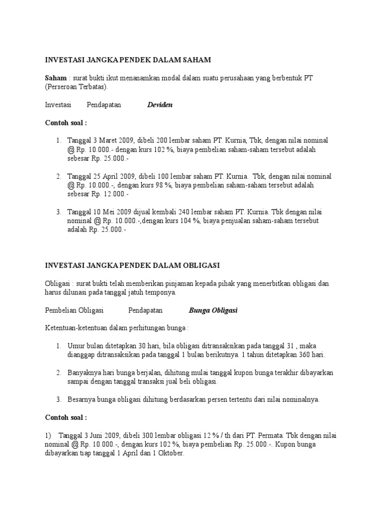 Contoh investasi jangka panjang. Risa membeli 100 lembar saham prioritas kumulatif 6 per tahun dari pt. Biaya pembelian materai dan komisi sebesar rp 50000 deviden saham pt. Emas merupakan logam mulia 9999 yang berharga dan langka yang kehadirannya bisa diterima semua kalangan. Nah pada saat saat seperti itu banyak orang terutama ibu rumah tangga telah melakukan perencanaan keuangan yang akan digunakan dalam jangka 1 bulan ke depan. Pada tanggal 1 april 2013 ny. Contoh soal investasi jangka panjang dalam saham.