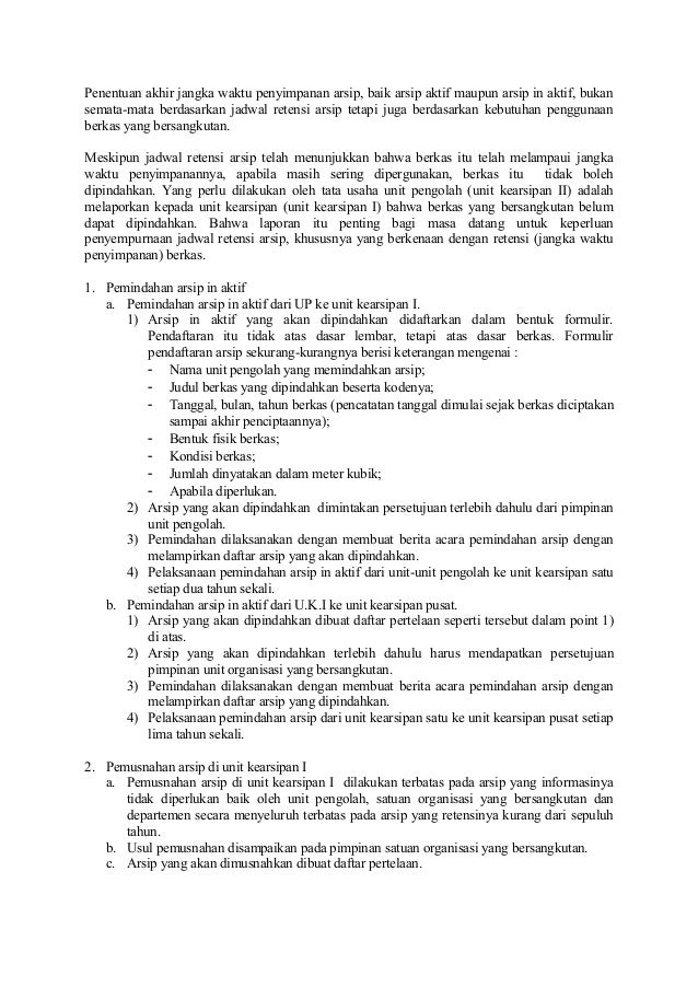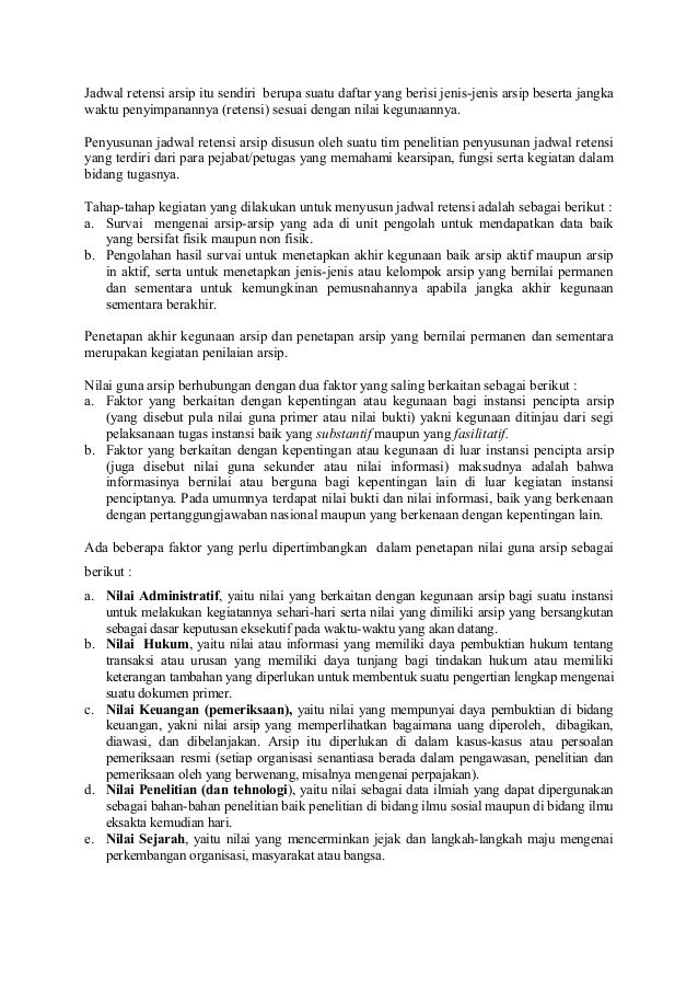 Jadwal retensi arsip jra menurut undang undang nomor 43 tahun 2009 adalah daftar yang berisi sekurang kurangnya jangka waktu penyimpanan atau retensi jenis arsip dan keterangan yang berisi rekomendasi tentang penetapan suatu jenis arsip dimusnahkan dinilai kembali atau dipermanenkan yang dipergunakan sebagai pedoman penyusutan dan penyelamatan arsip. Arsip dengan susunan kronologis yaitu terdapat batas tahun yang masih jelas tetapi masalah satu dengan yang lainnya masih bercampur begitu juga antara arsip dan non arsip. Berkas ini saya dapatkan ketika magang di arsip ugm tanggal 18 22 agustus 2014 yang baru lalu. Arsip kacau adalah arsip yang tidak teratur disebabkan terjadinya percampuradukan antara arsip dengan non arsip berserakan tidak beraturan. Solusi dari masalah tersebut adalah dengan dilaksanakan penyusutan arsip keuangan secara sistematis yang berpedoman pada jadwal retensi arsip jra. Jenis jenis arsip dan contohnya pengertian kearsipan adalah suatu proses mulai dari penciptaan penerimaan pengumpulan pengaturan pengendalian pemeliharaan dan perawatan serta penyimpanan data dan informasi menurut sistem tertentuselain itu pengertian arsip dan kearsipan juga mencakup sumber informasi dalam berbagai bentuk baik teks tulisan audio video digital dan lain lain.