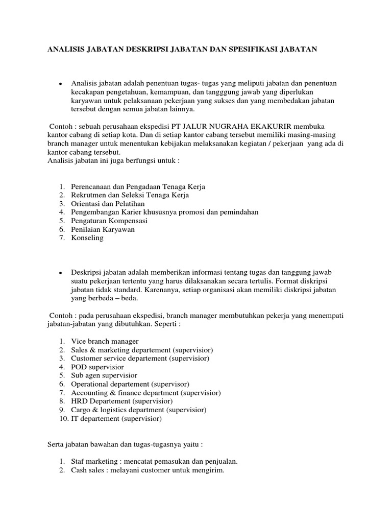 Membuat program kerja travel 2. Tentu saja job analysis tersebut akan berubah sewaktu waktu tergantung periode yang dijalani. Melayani pelanggan dengan baik 1. Menurut grensing pophal job description adalah sebuah rekaman tertulis. Isi dari rekaman tertulis tersebut adalah seputar tanggung jawab dari pekerjaan tertentu. Contoh2 job description lengkap untuk 70 posisi jabatan di dalam perusahaan tanggal efektif.