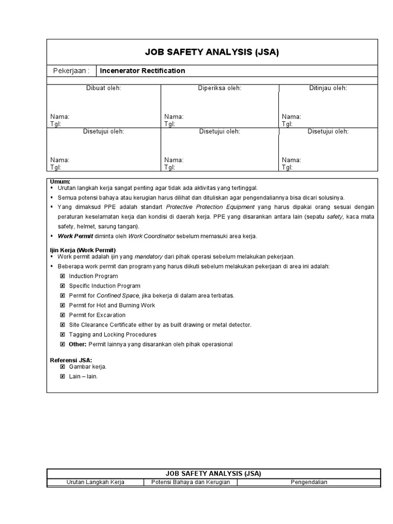 Job safety analysis jsa atau di kenal dengan juga job hazard analysis adalah upaya mempelajari serta pencatatan masing masing urutan langkah kerja satu pekerjaan mengidentifikasi bahaya bahaya di dalamnya dan memastikan usaha paling baik untuk mengurangi maupun menyingkirkan bahaya bahaya disuatu pekerjaan itu. Implementasi job safety analysis jsa pada kegiatan finishing di industri mebel kec. Berikut adalah contoh jsa kosong dan 10 tahap dalam cara membuat jsa. Think safety do safely atas perhatiannya. Job safety analysis jsa atau di kenal dengan juga job hazard analysis adalah upaya mempelajari serta pencatatan masing masing urutan langkah kerja satu pekerjaan mengidentifikasi bahaya bahaya di dalamnya dan memastikan usaha paling baik untuk mengurangi maupun menyingkirkan bahaya bahaya disuatu pekerjaan itu. Gowa 2017 skripsi diajukan untuk memenuhi salah satu syarat meraih gelar sarjana kesehatan masyarakat prodi kesehatan.