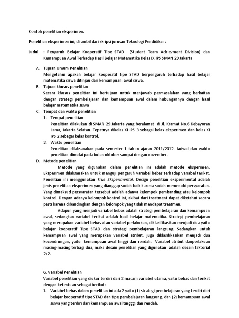 Pada dasarnya penelitian ini bertujuan untuk mengetahui pengaruh penerapan pembelajaran kontekstual dan gaya berpikir siswa terhadap prestasi belajar matematika siswa dengan memanipulasi variabel bebas yaitu pembelajaran kontekstual dan gaya berpikir siswa sedangkan variabel yang lain tidak bisa dikontrol secara ketat sehingga desain penelitian yang digunakan adalah desain eksperimen semu. Contoh judul ini hanya sebagai referensi. 25 judul skripsi eksperimenkuantitaif pendidikan lihat juga cara membuat judul skripsi pendidikan eksperimenkuantitatif pe. Contoh jurnal inilah contoh judul penelitian eksperimen murni yang anda perlukan. Contoh judul penelitian eksperimen. Rendahnya daya saing di ajang internasional.