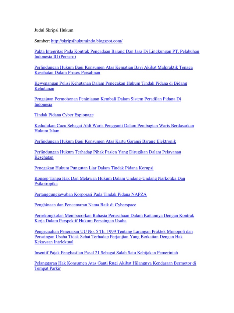 Contoh judul skripsi hukum. Ada banyak sekali judul skripsi hukumyang bisa anda jadikan sebagai referensi dan inspirasi untuk skripsi anda. Berikut ini adalah contoh judul skripsi hukum terbaru lengkap yang bisa menjadi bahan rujukan dan pertimbangan bagi kawan semua para mahasiswa jurusan ilmu hukum yang ingin menyusun skripsidengan mudah. Oleh karenanya mahasiswa butuh referensi judul dan contoh skripsi tentang hukum pidana yang lengkap untuk dijadikan penelitian terdahulu. Contoh 200 judul skripsi hukum pidana paling mudah dikerjakan patut teman teman pertimbangkan sebagai bahan referensi pemilihan judul skripsi karena mudah dikerjakan dan dapat mempermudah teman teman dalam menyusun skripsi. Berikut ini kami akan berikan kumpulan contoh judul skripsi semua jurusan terbarumeliputi judul skripsi fakultas ekonomi fakultas hukum fakultas ilmu budaya fakultas ekonomika bisnis fakultas ilmu sosial politik fakultas psikologi fakultas kedokteran fakultas kesehatan masyarakat fakultas matematika fakultas perikanan ilmu kelautan fakultas teknik dan lain lain. Contoh judul skripsi hukum apabila anda seorang mahasiswa semester akhir jurusan hukum tentu saja saat ini anda sedang sibuk menyiapkan judul skripsi untuk menyelesaikan studinya.