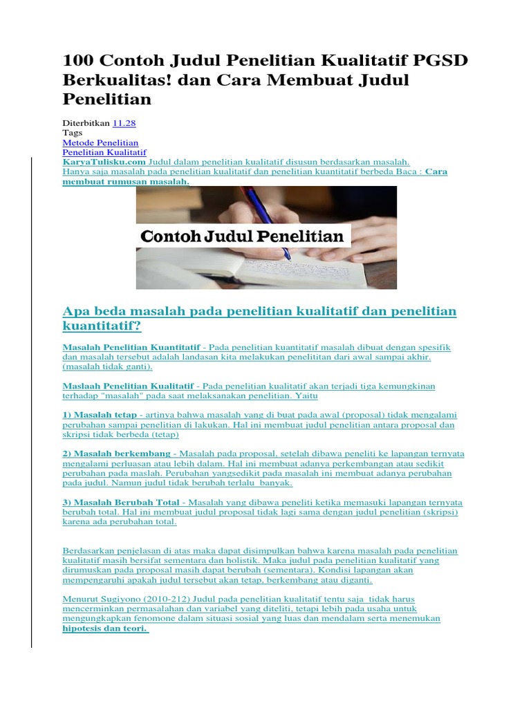 Contoh judul penelitian kualitatif skripsi kualitatif pgsd judul skripsi kualitatif judul skripsi pgsd download contoh skripsi. Demikian informasi yang bisa kami berikan kepada anda mengenai apa saja contoh judul penelitian kualitatif. Temukan contoh judul skripsi kualitatif pgsd di situs ini. Penelitian kualitatif menurut para ahli. Download contoh skripsi pendidikan pgsd lengkap file pdf sekali klik 100 contoh judul penelitian kualitatif pgsd berkualitas. Skripsi kuantitatif pgsd terbaik dan mudah dikerjakan ini dikhususkan bagi anda yang tertarik untuk menggunakan metode kuantitatif dalam skripsinya.