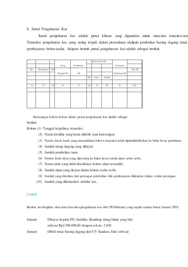Cahaya selama bulan juli 2010 antara lain sebagai berikut. Misalnya dalam perusahaan yang sering melakukan transaksi pembelian kredit sehingga sering melakukan transaksi pembayaran hutang dalam jurnal pengeluaran kas harus disediakan kolom khusus untuk akun utang dagang. Jurnal khusus pengeluaran kas adalah jurnal yang digunakan untuk mencatat transaksi keuangan yang dapat mengurangi saldo kas perusahaan transaksi transaksi tersebut antara lain yaitu transaksi transaksi pembayaran utang pembelian tunai transaksi penerimaan kembali barang yang telah dijual secara tunai retur penjualan dan transaksi pembayaran biaya lain lain yang masuk dalam kolom serba serbi. Dana kas kecil adalah uang kas yang disediakan untuk membayar pengeluaran pengeluaran yang jumlahnya relative kecil dan tidak ekonomis bila dibayar dengan cek. Berikut ini adalah contoh analisis transaksi yang terdapat pada jurnal khusus pengeluaran kas. Berikut ini adalah contoh analisis transaksi yang terdapat pada jurnal khusus pengeluaran kas.