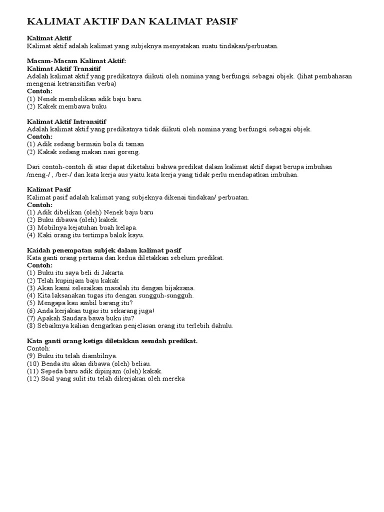 Aku pergi ke rumah nenek. Kalimat aktif intransitif pengertian ciri dan contohnya kalimat aktif merupakan kalimat yang subjeknya menjadi pelaku atas objeknama lain dari kalimat ini adalah kalimat perbuatan ataupun kalimat pelaku. Kalimat ini mempunyai sejumlah jenis yaitu. Pertama kalimat aktif yakni kalimat yang subyeknya melakukan pekerjaan. Kalimat ini biasa disebut juga sebagai kalimat subjek ataupun tindakan. Kalimat aktif merupakan kalimat yang subjeknya aktif melakukan kegiatan atau aktifitas yang tertera dalam kalimat.