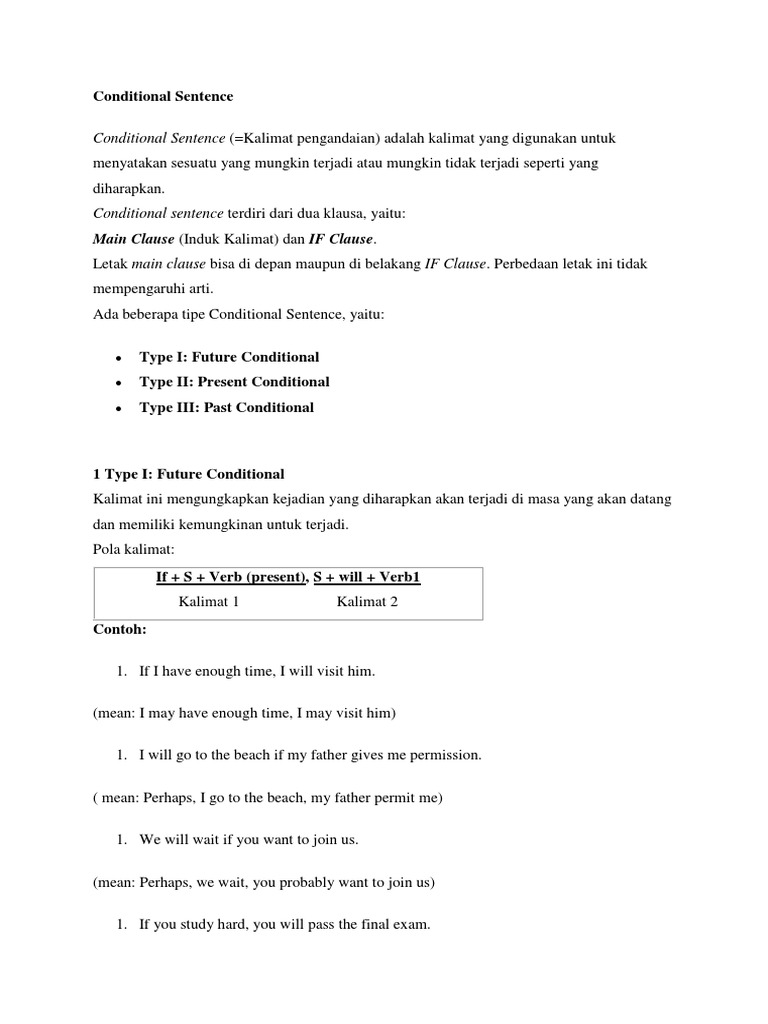Pengertian rumus conditional sentence type 123 dan contoh kalimatnya. Berikut ini adalah contoh kalimat conditional sentence type 2. If past tense would verb i. If clause dapat menempati awal atau tengah kalimatketika if clause menempati awal kalimat koma ditempatkan sebelum main clause. If i have free time i will go swimming. Jika saya punya waktu luang saya akan pergi berenang 2.