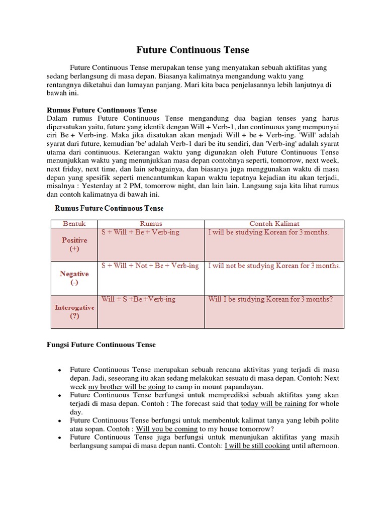 Fungsi dan contoh kalimat future perfect continuous tense. Rumus future perfect continuous tense fungsi dan contoh kalimat future perfect continuous tense. Apabila pada materi sebelumnya kalian telah mempelajari dan memahami rumus rumus ke 16 tenses dalam bahasa inggris pada artikel tenses bahasa inggris maka materi kali ini tidak akan sulit untuk dipelajari. Iya memang benar kita akan mengulik simple future tense dalam hal contoh contoh kalimatnya dalam bahasa inggris lebih banyak lagi agar kalian memahami penggunaannya dalam suatu kalimat. Future perfect continuous tense digunakan untuk membicarakan tentang aksi yang panjang sebelum titik waktu tertentu di masa depan. Future continuous tense untuk mengindikasikan suatu aksi yang akan sedang terjadi pada waktu tertentu di masa depan.