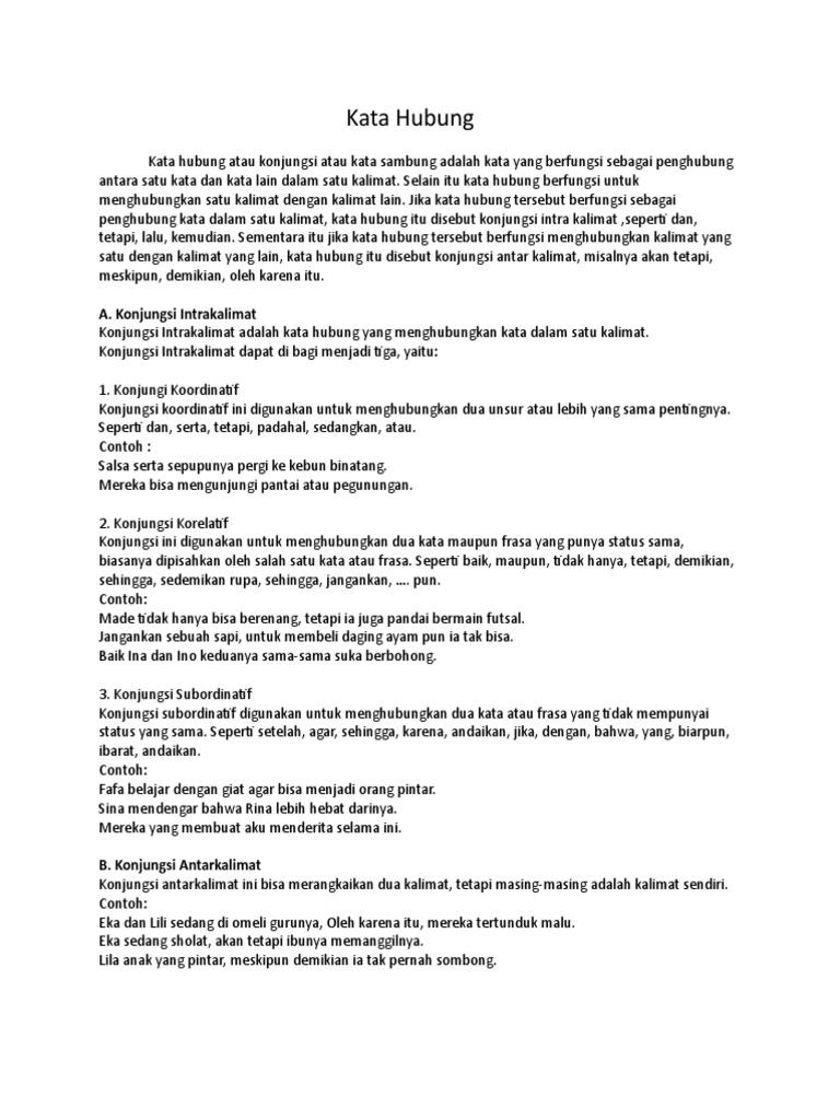 Konjungsi koordinatif pendampingan merupakan sebuah konjungsi yang menyatakan bahwa salah satu unsur dari klausa atau kalimat merupakan suatu pendamping bagi kata klausa frasa atau kalimat sebelumnya. Sebuah paragraf lazimnya disusun oleh kalimat kalimat yang satu sama lain berhubungan sehingga membentuk kesatuan yang bersifat kohesif dan koheren. Anak itu selalu mendapat juara ditingkat provinsi bahkan pernah juara di tingkat nasional. 6 salah satu alat pemadu kalimat kalimat pembangun paragraf itu adalah penghubung antarkalimat atau lazim juga disebut ungkapan. Konjungsi antar kalimat merupakan kata penghubung yang menghubungkan kalimat yang satu dengan kalimat yang lainnya. Dalam penggunaanya konjungsi antar kalimat menyatakan makna yang berbeda beda diantaranya.