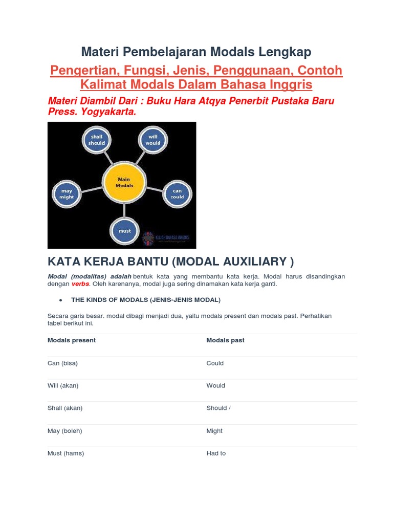 Dalam contoh kalimat kedua terdapat modal auxiliary have dan main auxiliary been yang diikuti dengan verbing driving. If he doesnt arrive on time hell have to take a later flight. Sebelumnya apakah sahabat sbi masih ingat yang di sebut dengan modal auxiliary verb itu seperti apa ya. Untuk menunjukkan waktu dapat ditambahkan adverb kata keterangan ke dalam kalimat tersebut seperti tomorrow every day yesterday dan lain sebagainya. Modal auxiliary verbs atau sering dikenal juga dengan istilah secondary auxiliary verbs merupakan kata kerja bantu yang memberikan arti tambahan pada main verbs dalam kalimat. Buku hara atqya penerbit pustaka baru press.