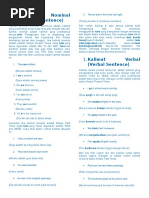 Contoh kalimat nominal sentence. Contoh kalimat past tense. Kalimat nominal nominal sentence adalah kalimat yang tidak mengandung kata kerja atau dengan kata lain kalimat nominal adalah kalimat yang predikatnya bukan kata kerja tetapi berupa kata benda noun. Kalimat nominal nominal sentence dan kalimat verbal verbal sentence juga merupakan salah satu dari pembagian kalimat tersebut. Kata sifat adjective atau kata keterangan adverb. Simple future tense adalah tense yang digunakan untuk mengungkapkan kejadian yang akan terjadi di masa depan. Kalimat verbal itu hanya punya satu ciri.