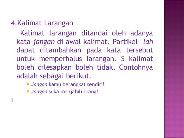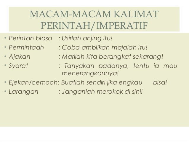 Kalimat imperative larangan adalah kalimat perintah yang di dalam kalimatnya terdapat kata larangan yang biasanya ditulis dengan menggunakan kata jangan. Kalimat perintah jenis ini memerintahkan ataupun meminta seseorang untuk tidak melakukan dan melarang orang lain dalam berbuat sesuatu. Sementara kalimat saran berupa perintah tetapi masih bisa ditoleransi jika tidak dilakukan. Contoh kalimat perintah kalimat perintah adalah salah satu kalimat yang mengandung makna perintah atau larangan. Pengertian kalimat perintah menurut kamus besar bahasa indonesia kbbi adalah kalimat yang mengandung intonasi dan makna perintah atau larangan. Contoh kalimat perintah dalam teks prosedur.