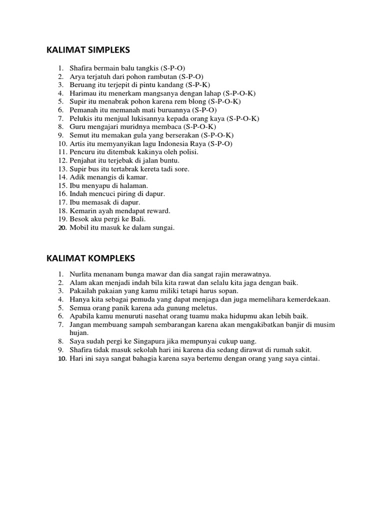 Contoh kalimat simpleks beserta spok. Selain itu kalimat simpleks tidak menggunakan kata penghubung dan merupakan kalimat tunggal. Pengertian jenis dalam hal ini di bahasa indonesia sendiri memiliki 2 macam jenis kalimat yakni kalimat simpleks dan kalimat kompleksyang dimana kedua kalimat ini memiliki pengertian dan ciri ciri yang berbeda. Posted in bahasa indonesia tagged 5 contoh kalimat simpleks ciri kalimat simpleks contoh kalimat simpleks beserta spok contoh kalimat simpleks setara kalimat simpleks dan contohnya pengertian kompleks. Kalimatid contoh kalimat kompleks tidak hanya di dalam bahasa inggris saja yang mempunyai macam macam dan struktur kalimat. 174 contoh kalimat simpleks dan kompleks. Contoh kalimat kompleks pengertian ciri ciri dan macam macamnya dalam bahasa indonesia ada dua tipe kalimat yaitu kalimat kompleks dan kalimat simpleks.