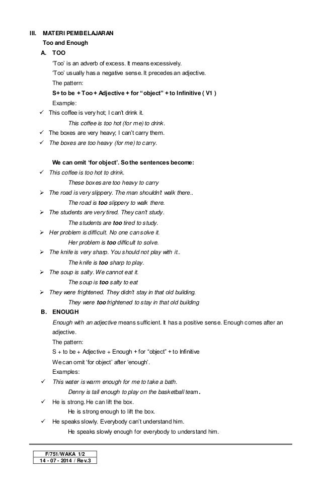 Contoh kalimat too and enough. Mereka tidak memiliki cukup uang. Seperti contoh paragraph bahasa inggris tentang hobi dan contoh paragraf bahasa inggris tentang liburanterapkan aturan yang sudah diketahui. We have enough books. X ada cukup sepatu untuk dipajang. There are enough shoe to display. This soup is too salt for me sup ini terlalu asin untuk ku this bread is too sweet for me roti ini sangat manis untuk ku it is too difficult for me ini terlalu sulit untuk ku.